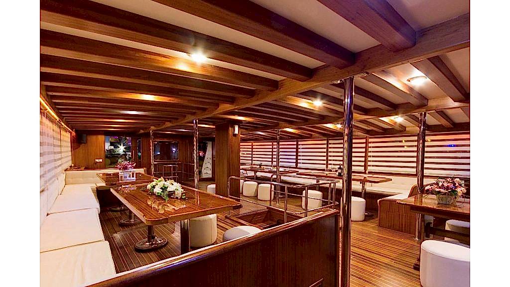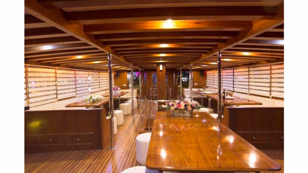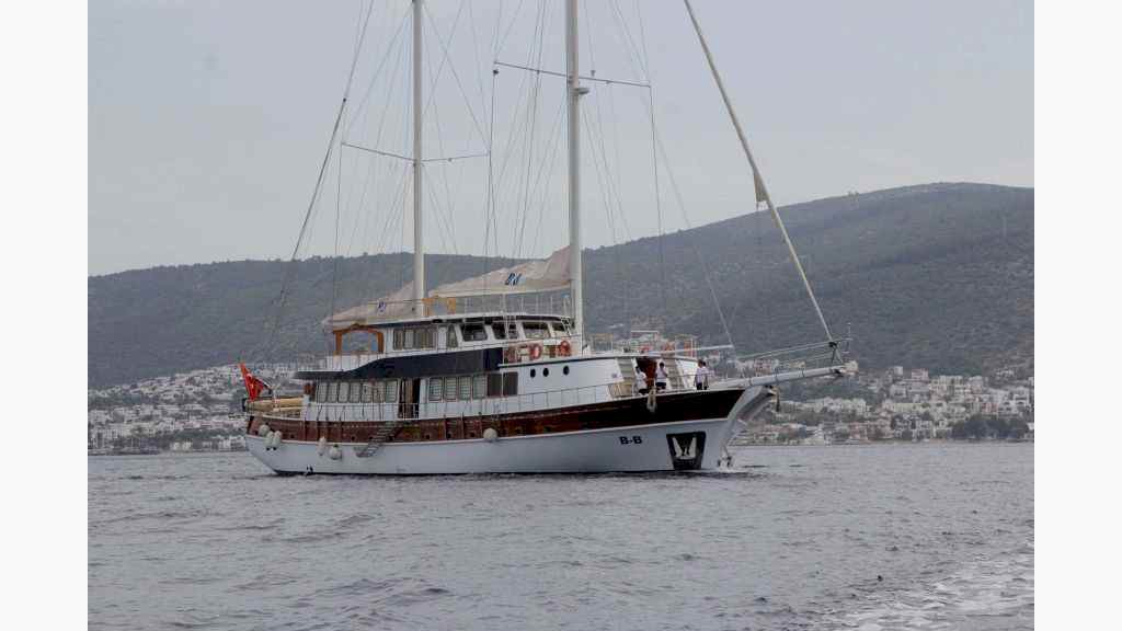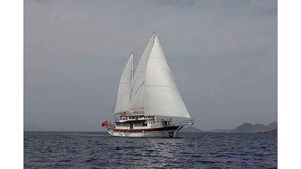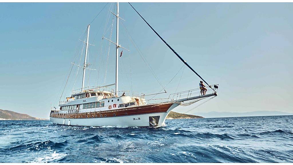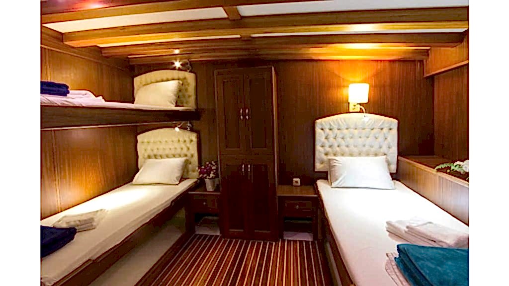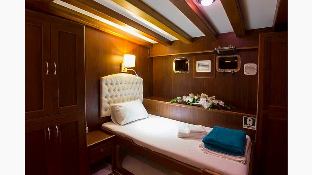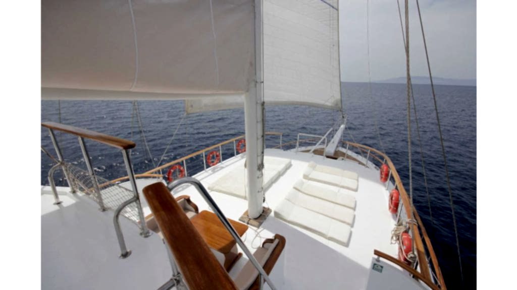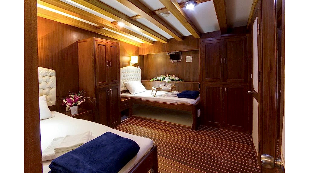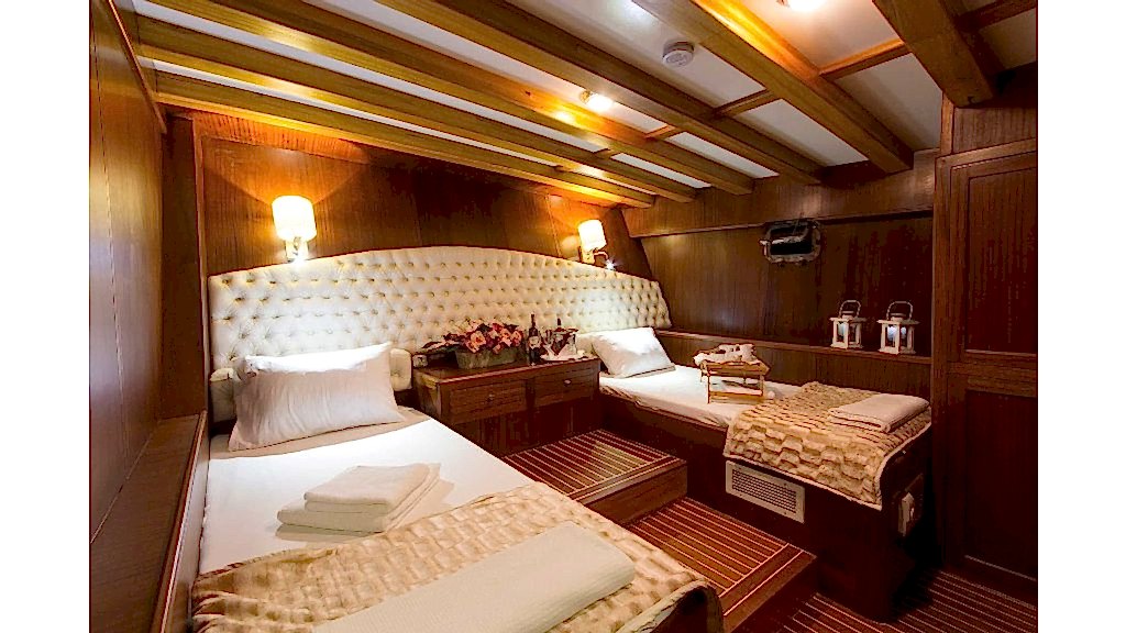 The “Boreas gulet” has 16 cabins (8 quat cabins, 4 double cabins, 1 triple cabin, 3 twin cabins) each more stylish and comfortable than the other, with its own shower, WC and air conditioning. Separate living areas for the crew, fully equipped kitchen, indoor and outdoor dining areas, relaxation areas and service bar are available. Boreas has enough sunbathing mats, chairs and service sets for all guests. In order not to be disconnected from the internet life during the holiday, we have wi-fi internet service valid within the borders of Turkish Waters on our boat. For the guests, optional water sports such as wakeboard, ringo, water ski are available.