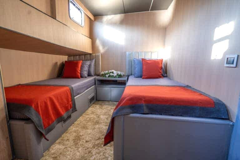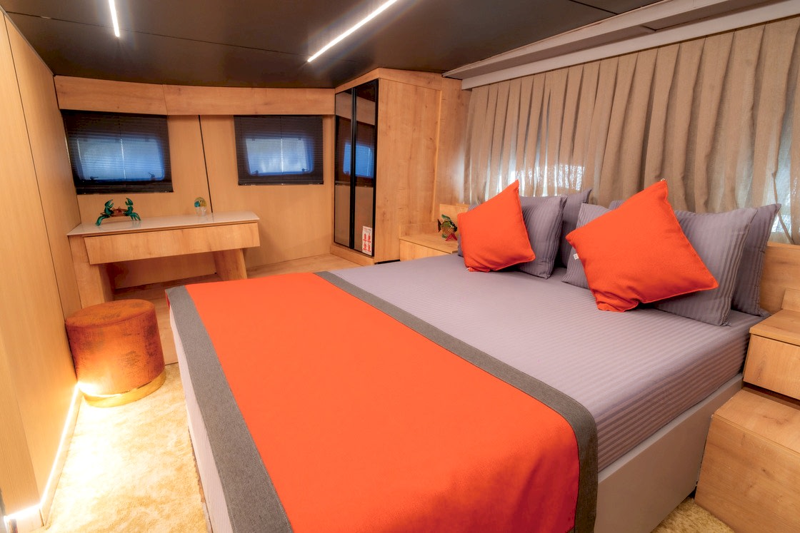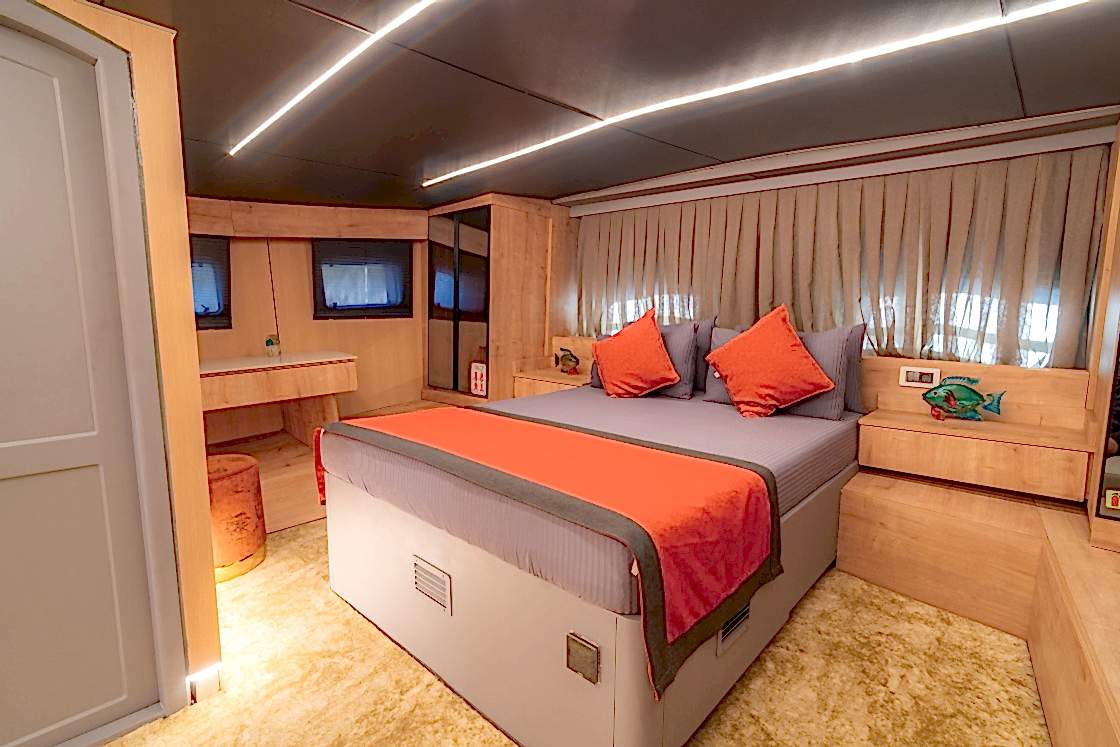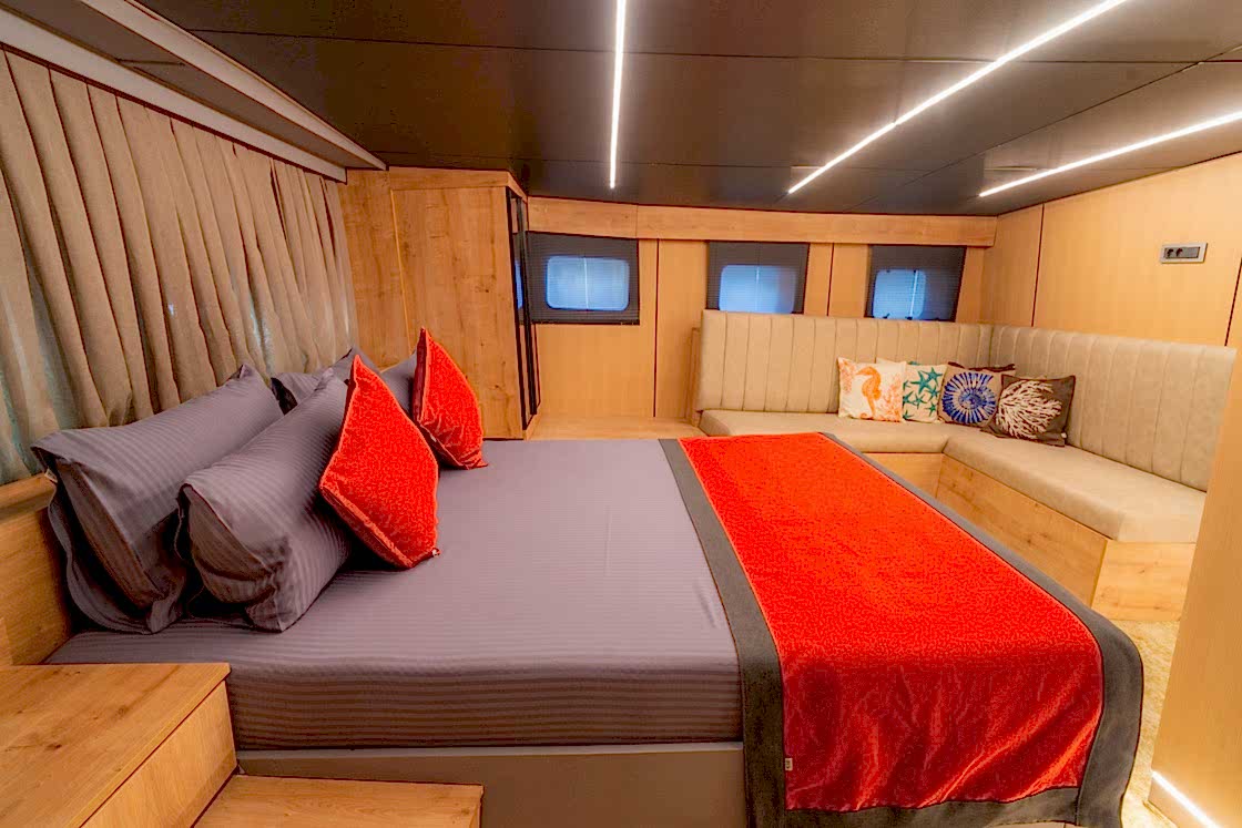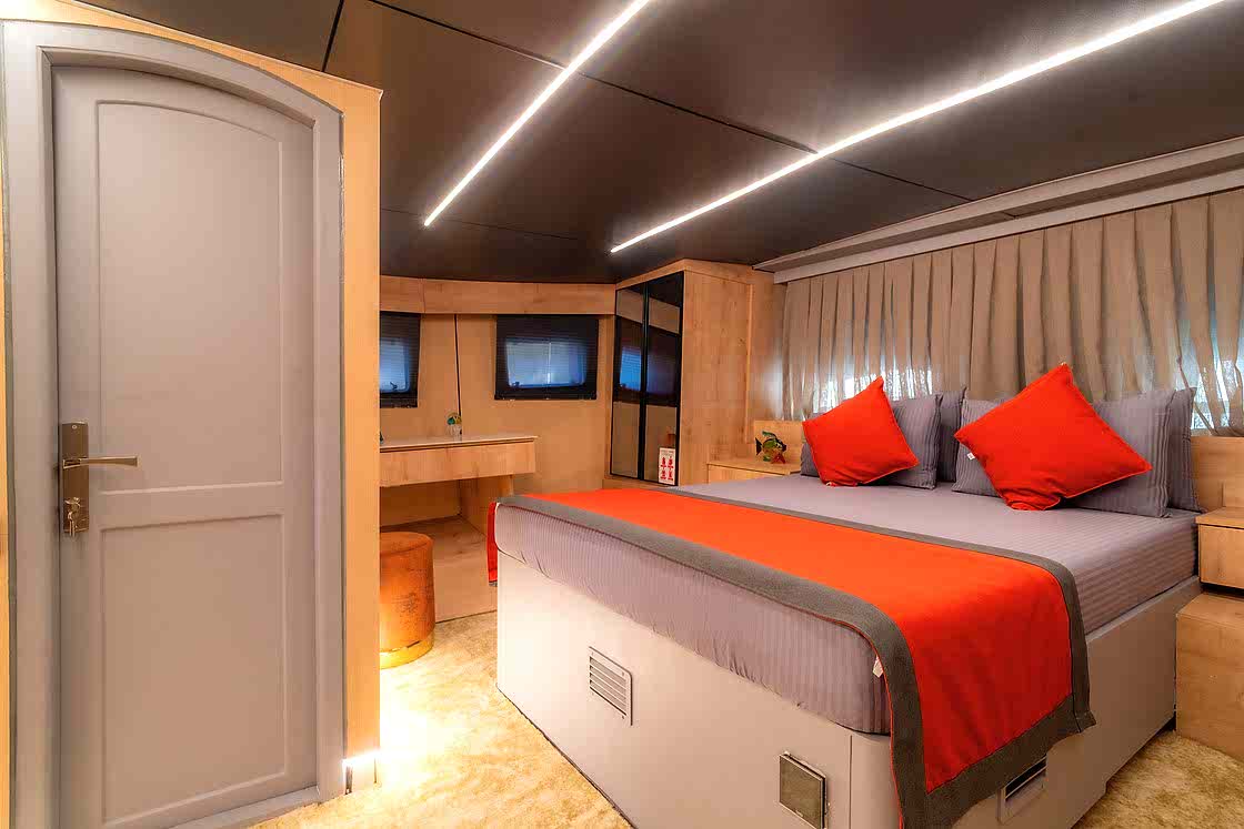 Princess Alize Gulet, measuring 29 meters, offers an unforgettable sailing experience with six cabins for up to 12 guests. Two master suites, two double, and two twin cabins provide private comfort, each equipped with en-suite bathrooms and 24-hour air conditioning.